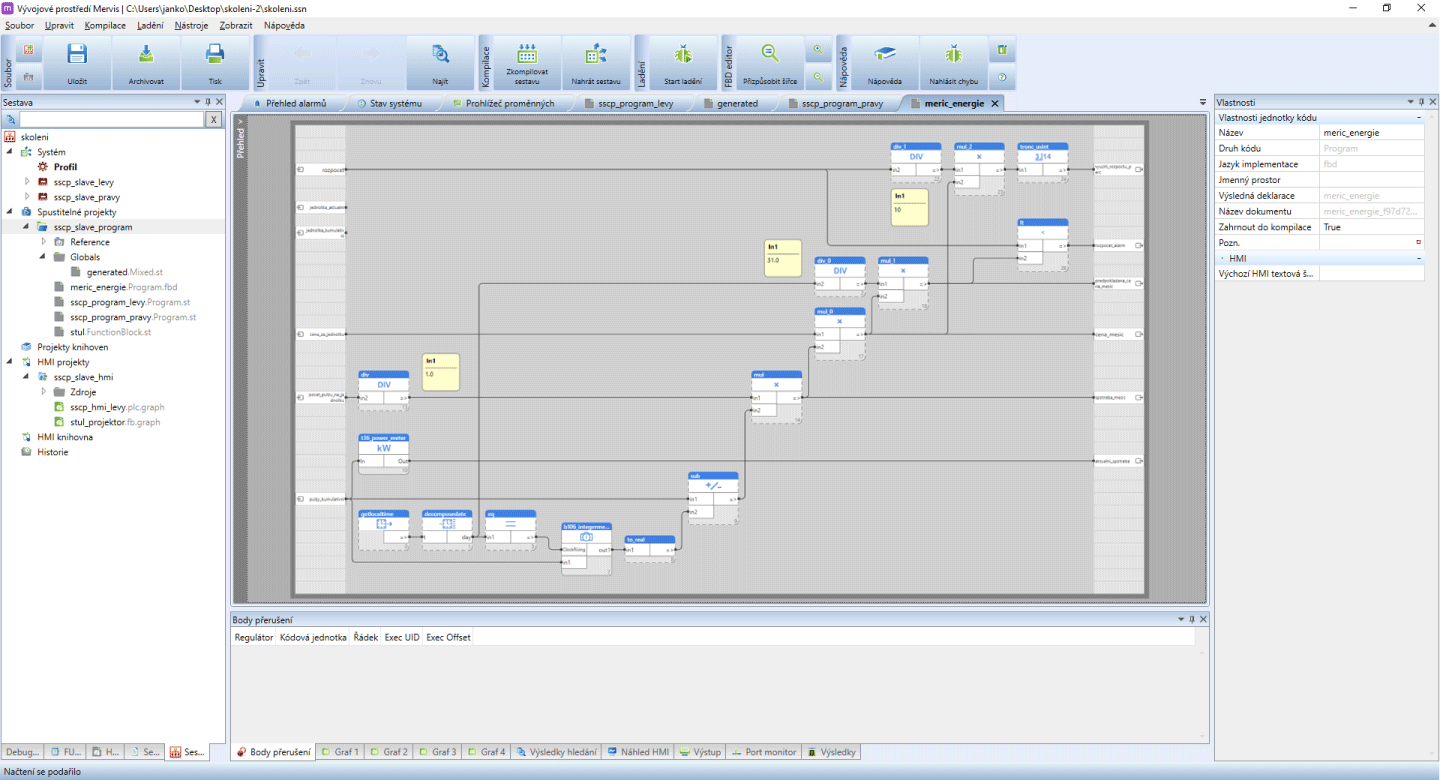 - Přidání bloků: Pravým tlačítkem klikněte do pracovní plochy a vyberte „Přidat knihovní blok“. Mervis IDE nabízí rozsáhlou knihovnu výchozích funkčních bloků pokrývajících většinu základních operací PLC – včetně matematických funkcí, regulačních smyček, čítačů nebo časových plánovačů.