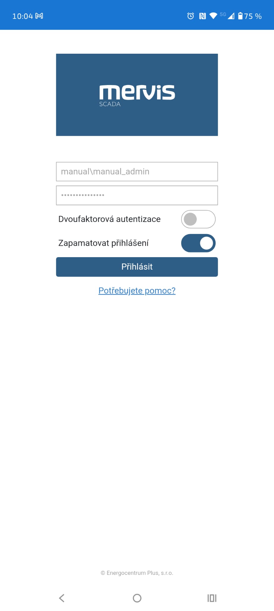 Po otevření aplikace Mervis SCADA (PWA) se zobrazí přihlašovací stránka, ve webovém prohlížeči dostupná na adrese: https://scada.mervis.info/mobile/#/login.