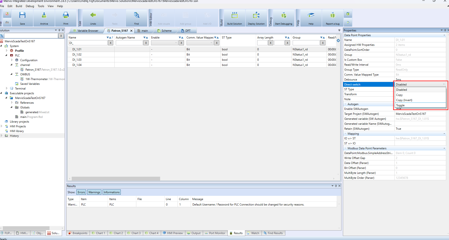 Funkci Direct Switch ovládáte pomocí tří jednoduchých proměnných pro každý vstup. Najdete je v panelu Vlastnosti (Properties Panel), když vyberete vstup v Průzkumníku sestavy (Solution Explorer).