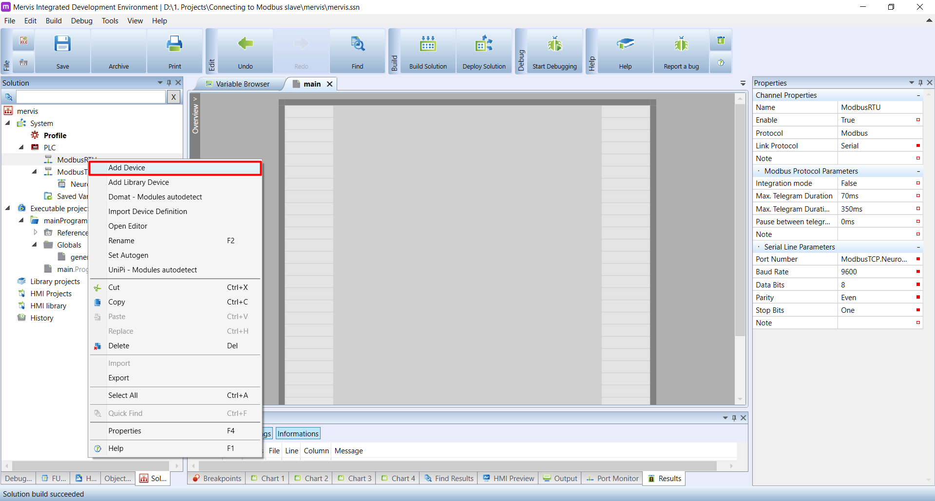 - Klikněte pravým tlačítkem na Modbus kanál a zvolte Add Device.
